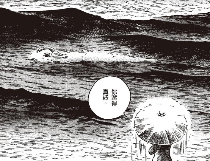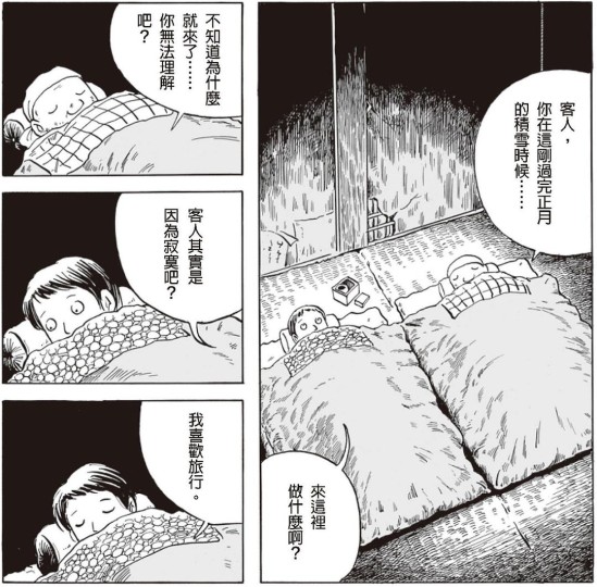 女主一人开始冒险,走向《混沌洞的笨先生》篇章(原名《ほんやら洞のべんさん》,台版收录于《柘植義春漫畫集:枯野之宿、窗邊的手》)。山中旅馆应该是义春最常见的题材,剧中列车穿过隧洞进入雪中世界,一瞬间很像雪国(我喜欢这个镜头)。